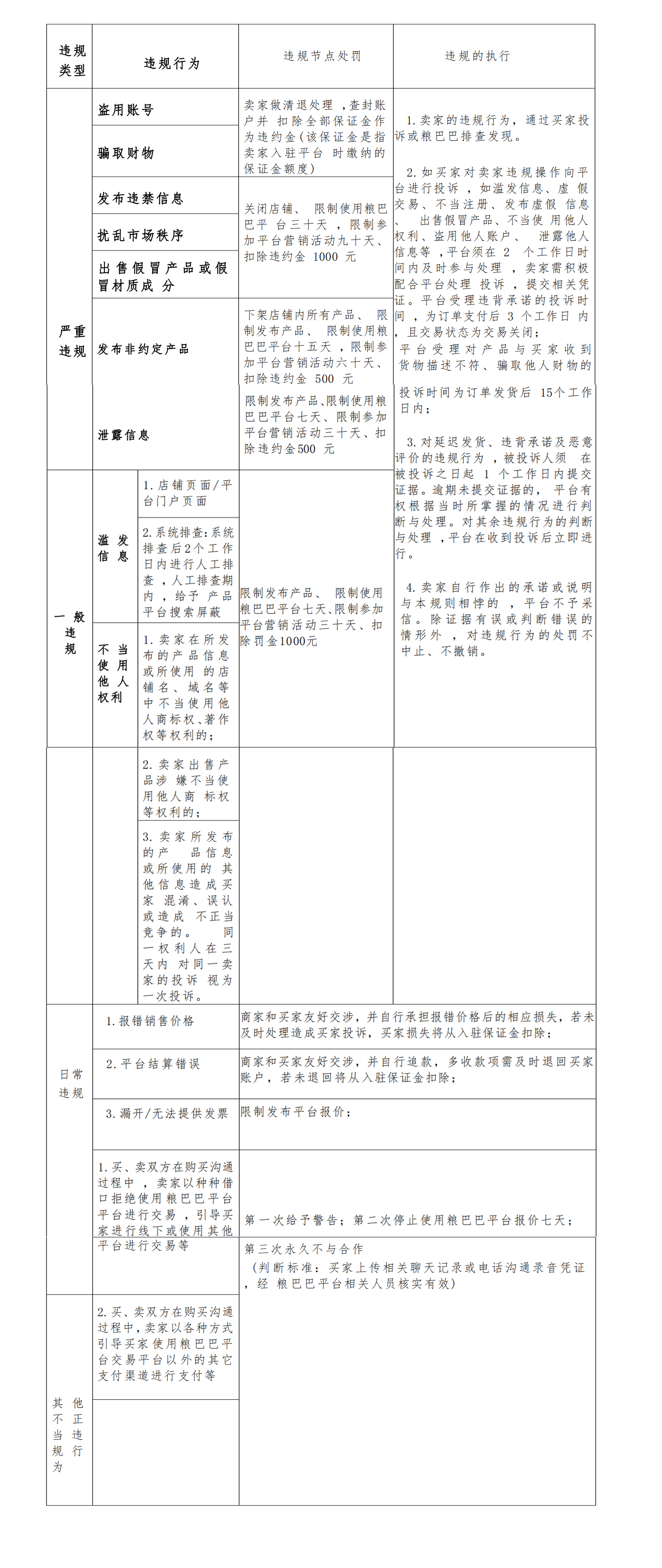 2、交易违规情况扣分细则见《粮巴巴大宗农产品交易平台卖家会员积分制度》。